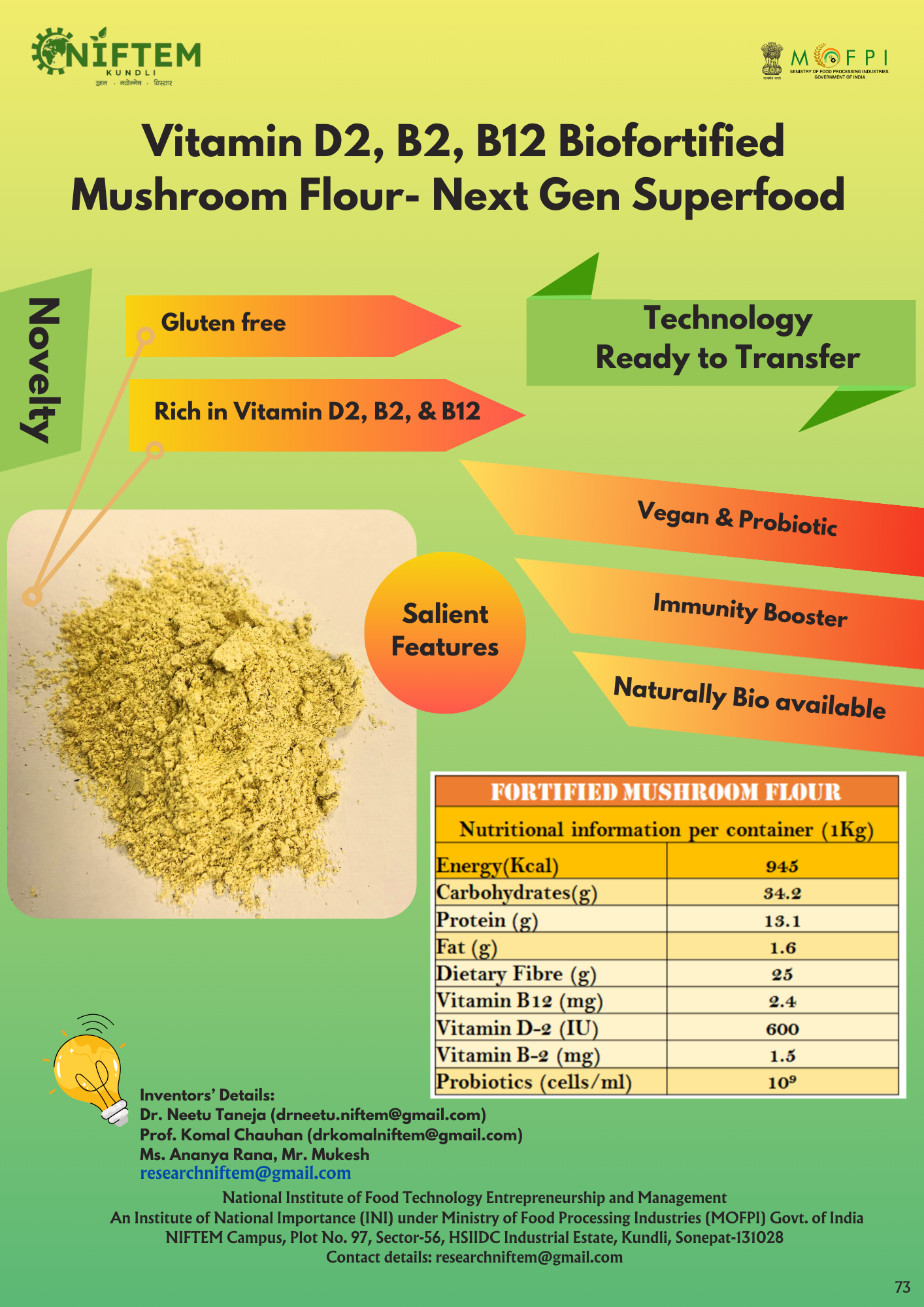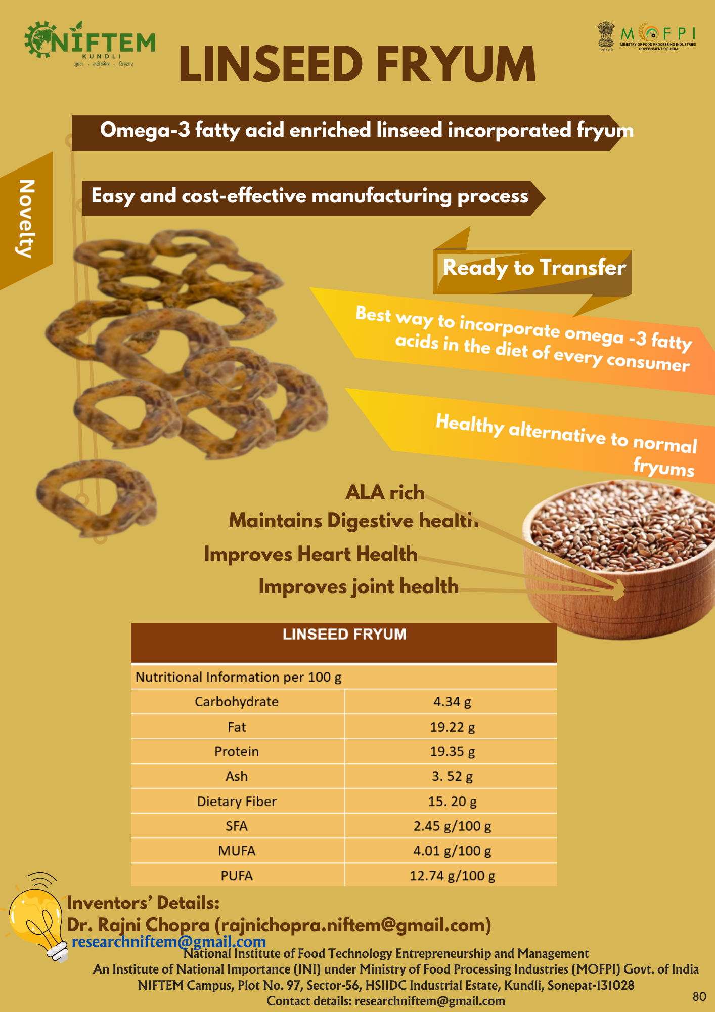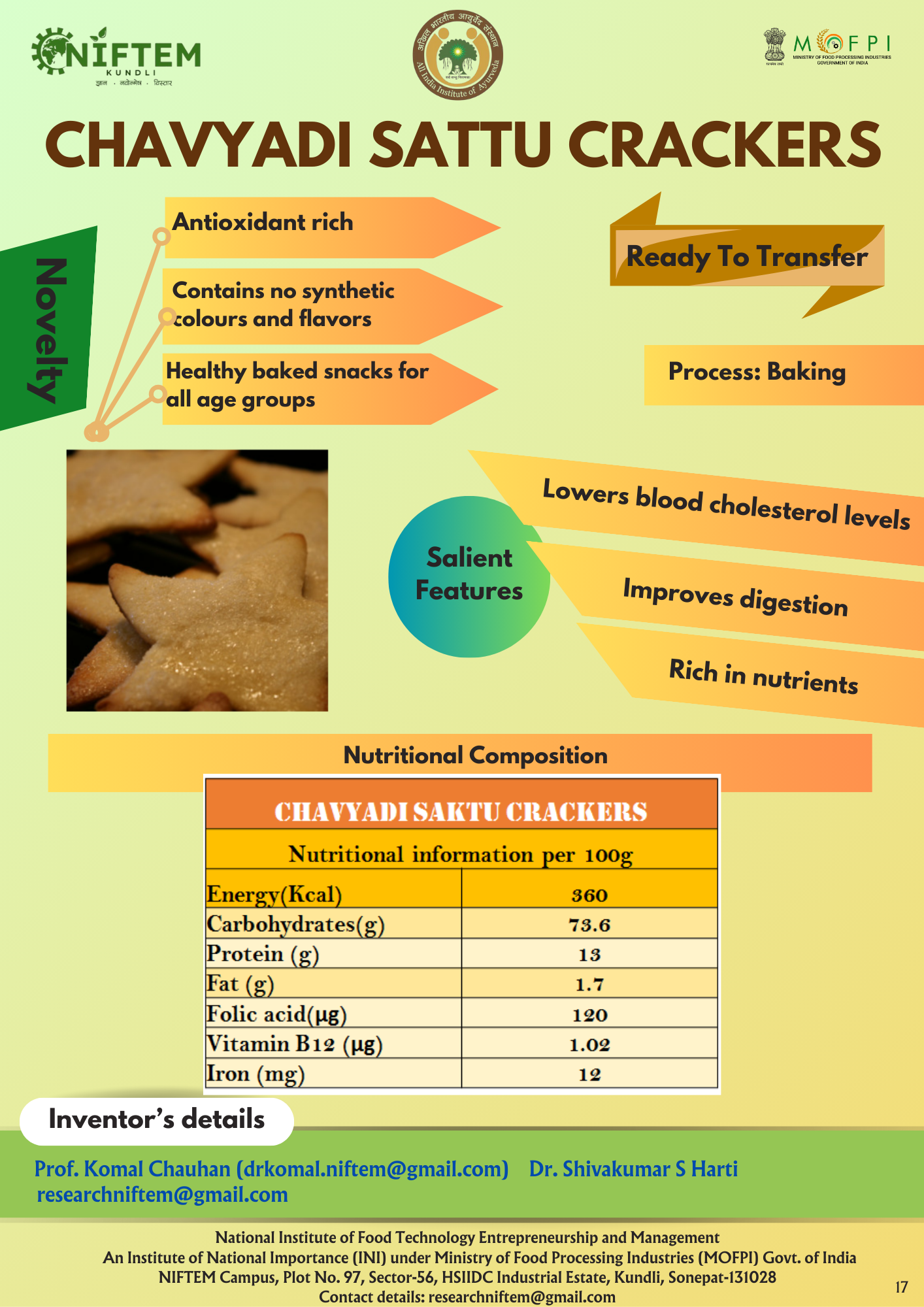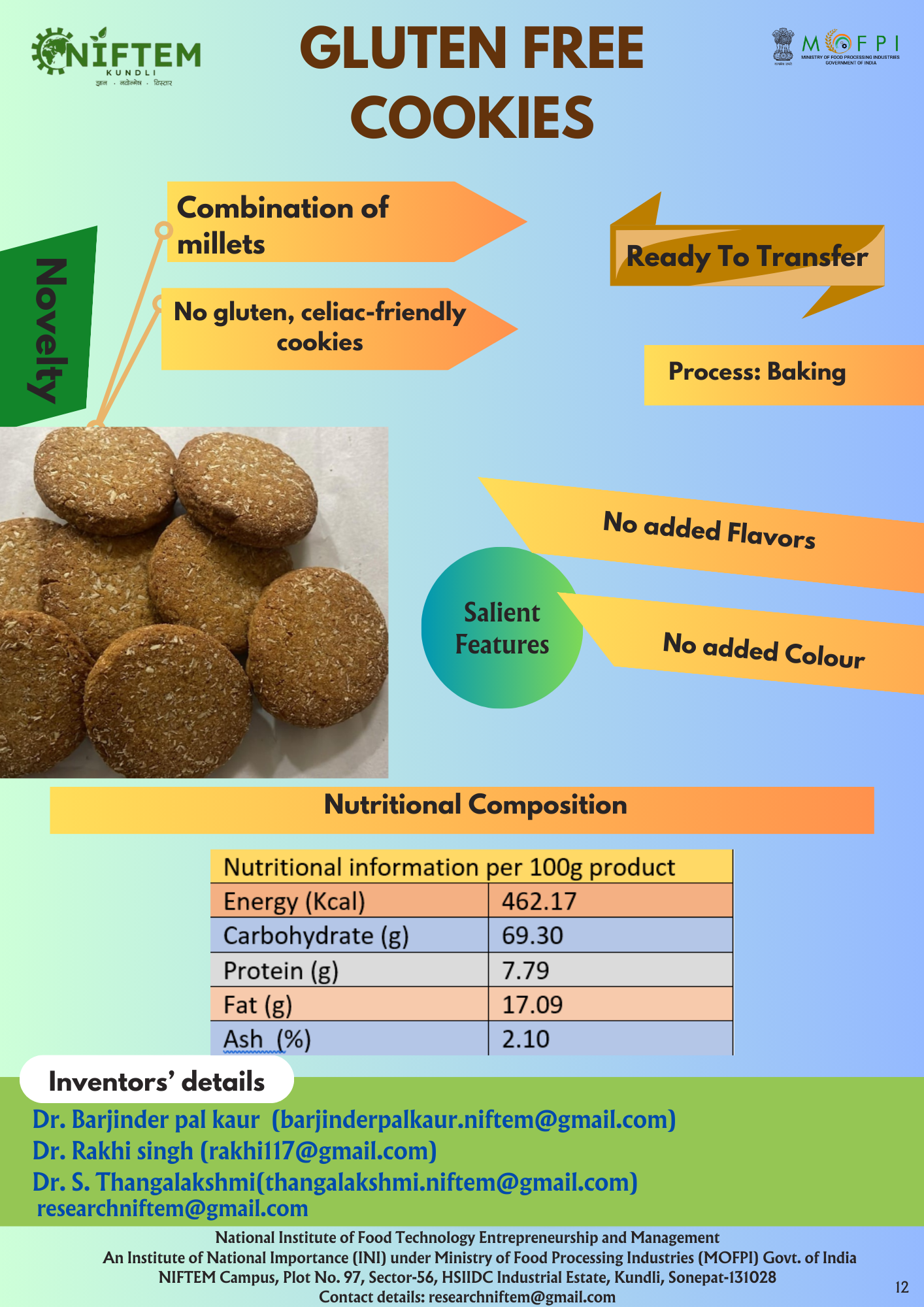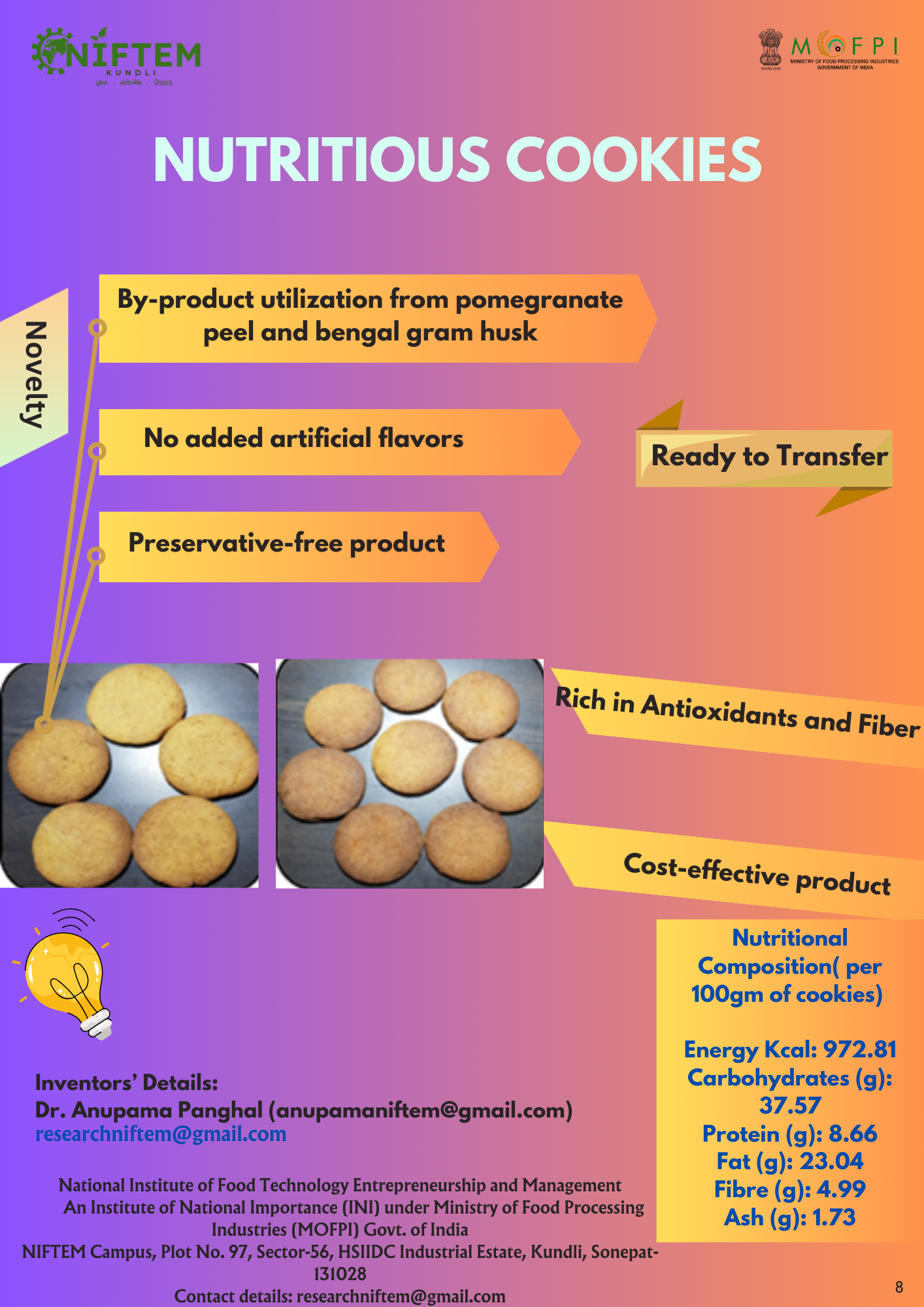 1.Fiber rich bread 2. Fiber rich muffins 3. Soup sticks 4. Biscuits- millet and non-millet based for malnourished 5. Fiber rich Cookies for diabetics "